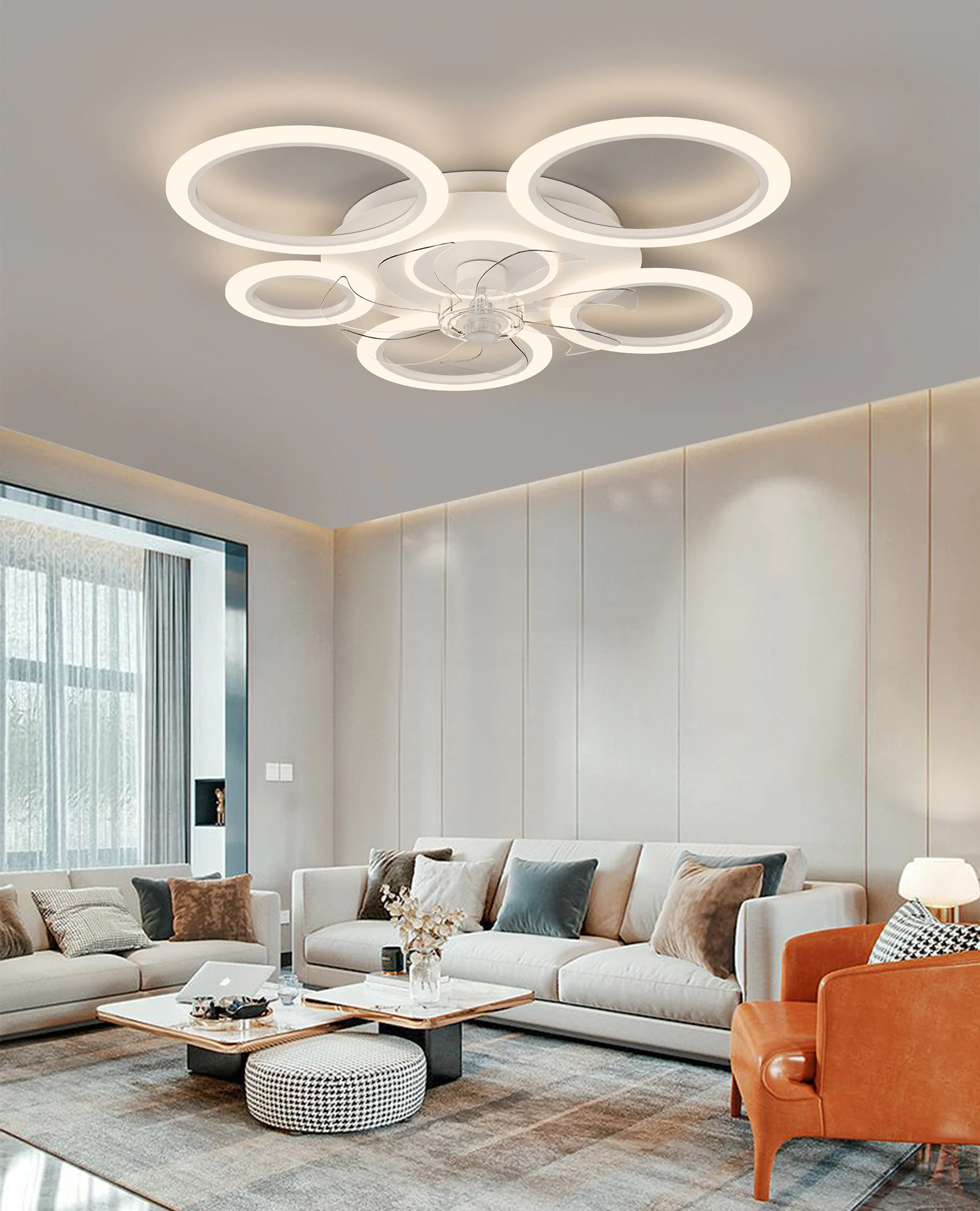 The flush‑mount design makes it ideal for both low and standard ceilings, offering a clean, uncluttered look. Quiet operation, customizable settings, and a modern aesthetic make this fixture a perfect upgrade for smart homes and stylish interiors.