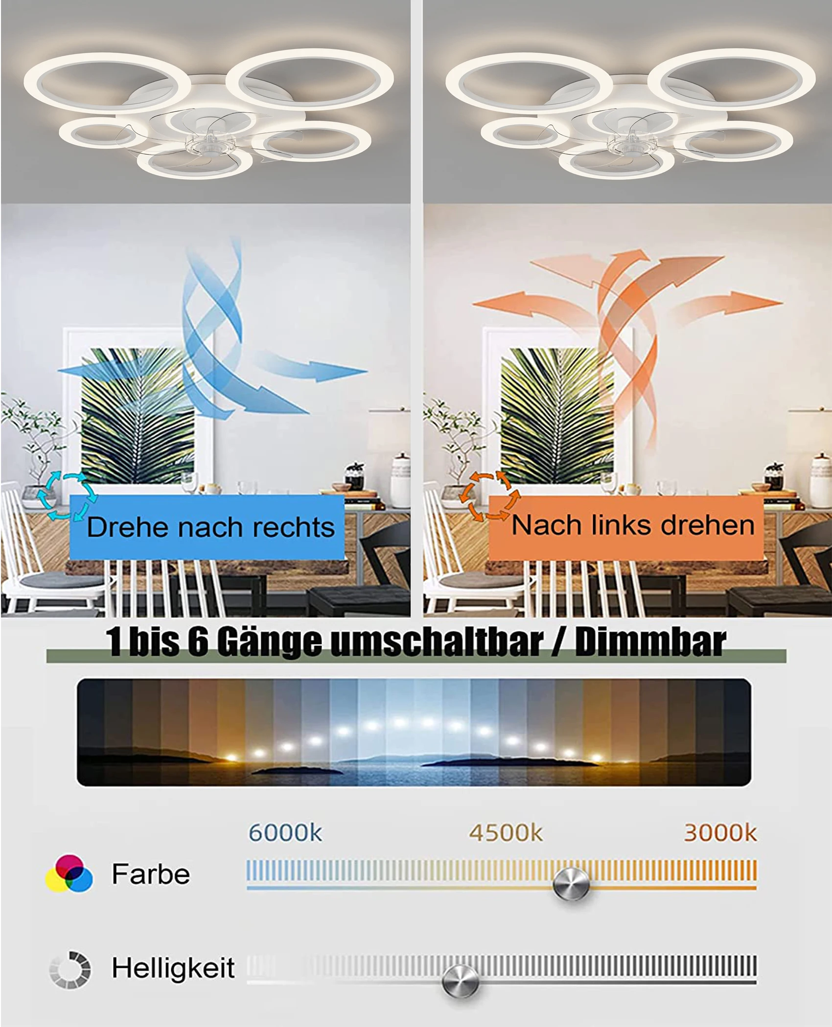 Equipped with APP control, the fan light allows you to adjust brightness, switch between 3 color temperatures (warm, neutral, cool), set timers, and control fan speed—all from your phone. The integrated dimmable LED lamp provides soft, energy‑efficient illumination, while the built‑in fan ensures comfortable airflow for living rooms, dining areas, bedrooms, and multifunctional spaces.