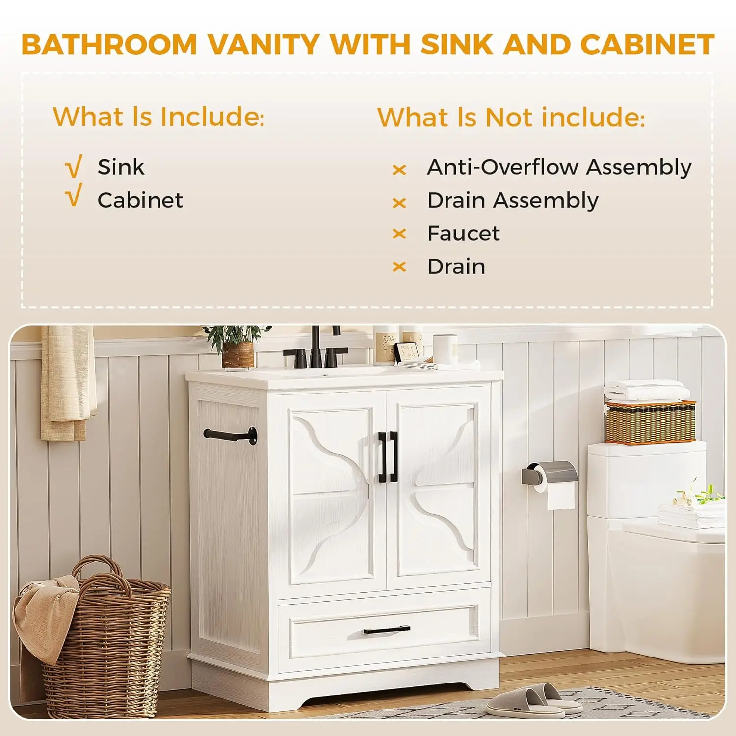 The under‑sink cabinet includes 2 soft‑closing doors and 1 smooth‑glide drawer, giving you organized storage for toiletries, towels, and daily essentials while maintaining a clean, minimalist look. Its 30″ size makes it an excellent choice for guest bathrooms, apartments, or smaller spaces where style and function still matter.