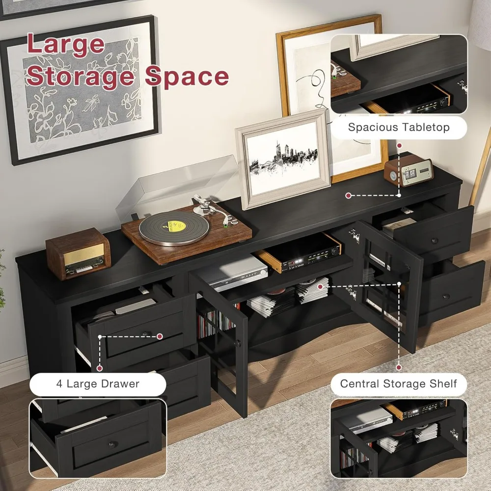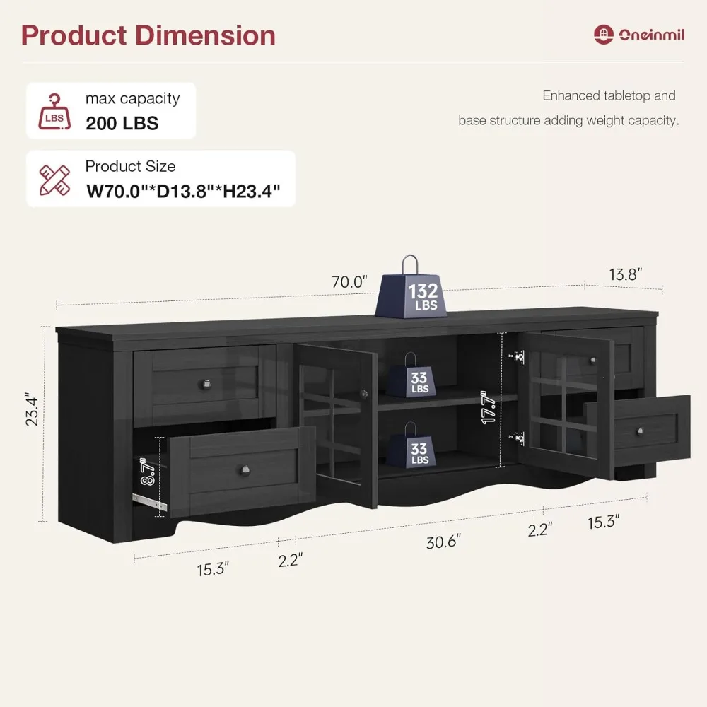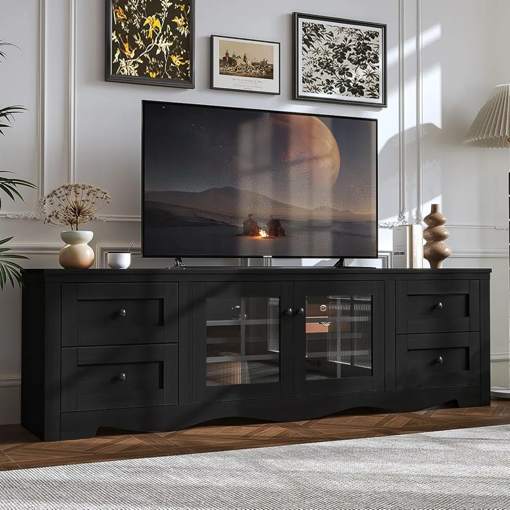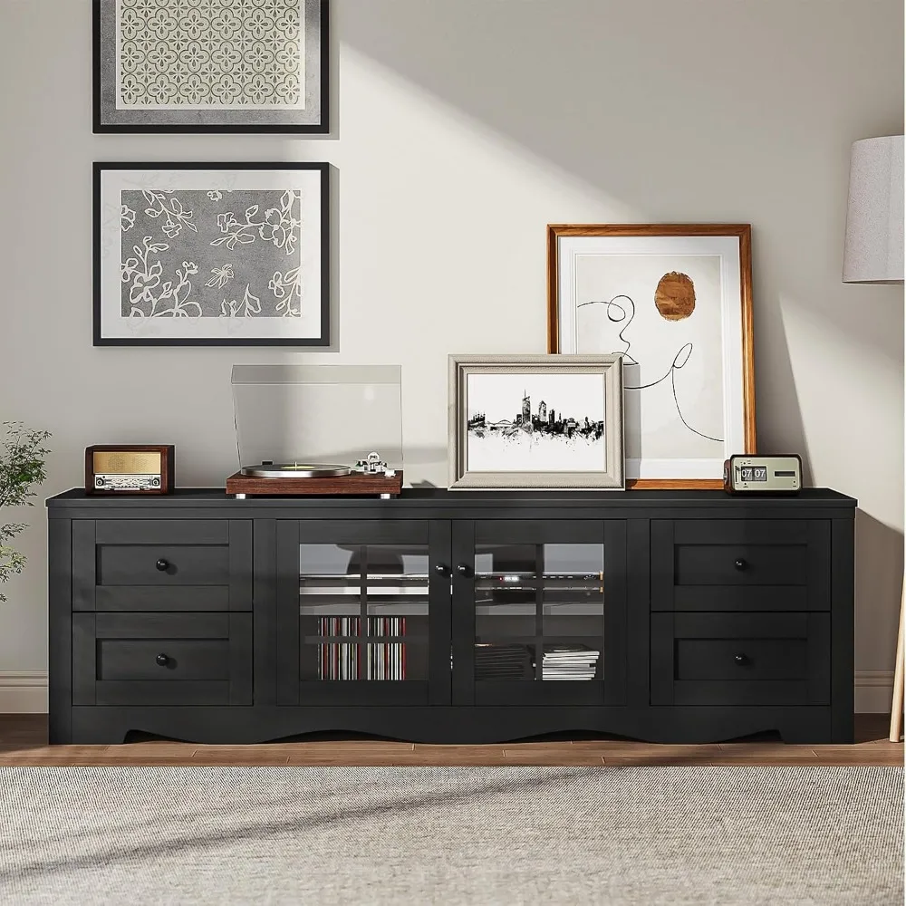 This 70″ modern TV stand combines sleek design with generous storage, making it the perfect centerpiece for any contemporary living room. Crafted from high‑quality wood, it features clean lines and a spacious layout that supports large TVs while enhancing your home’s dĂ©cor. The four large drawers provide ample hidden storage for remotes, cables, games, and accessories, keeping your space neat and clutter‑free.