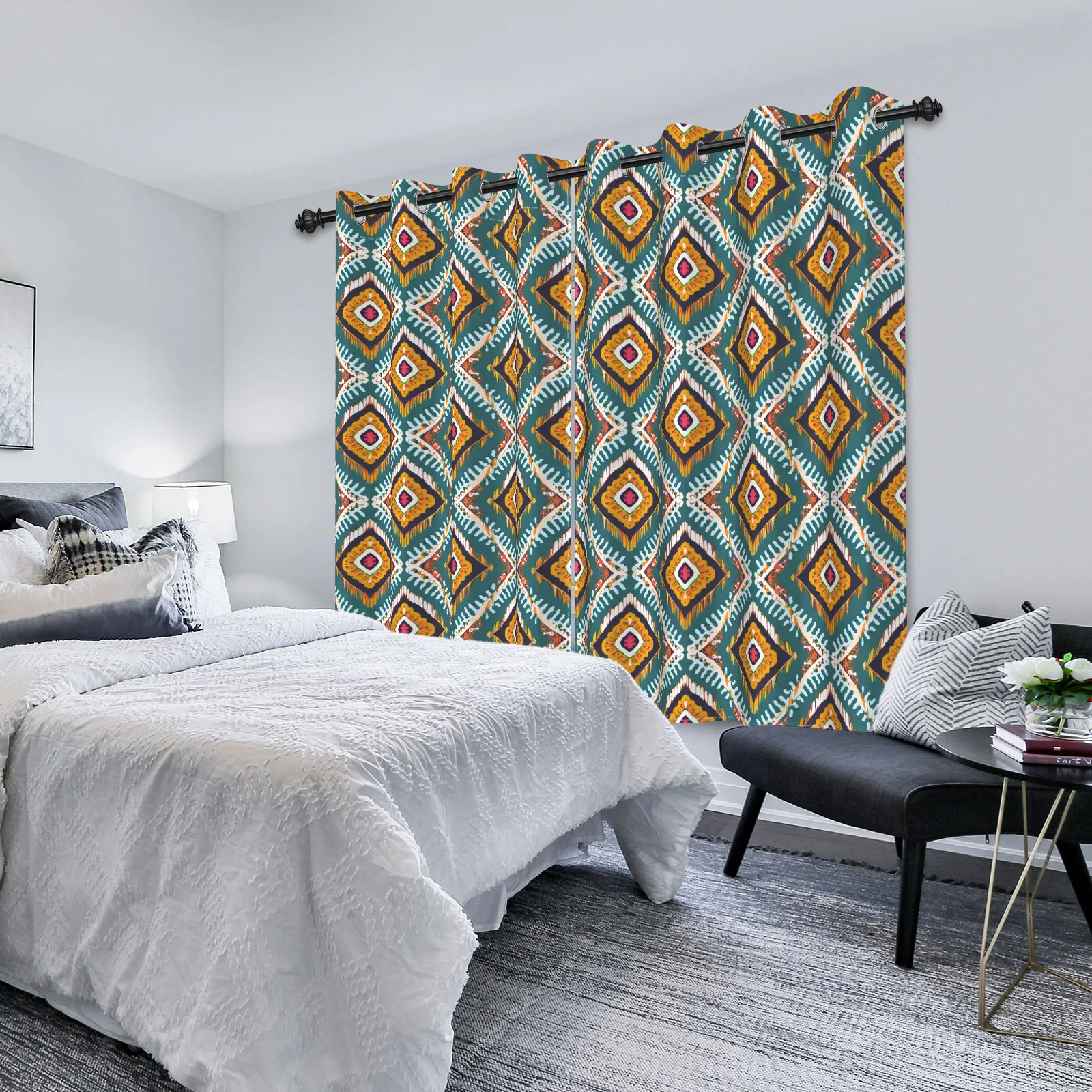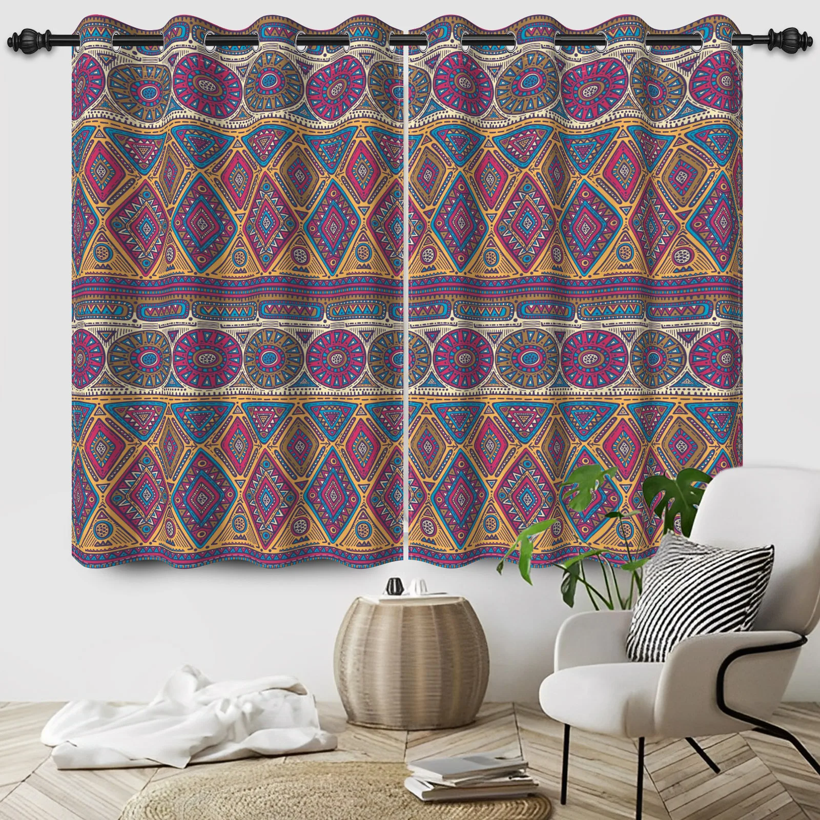 Add bold style and personality to your home with this 2-piece set of vibrant Bohemian blackout curtains featuring eye-catching geometric patterns and black floral accents. Designed to bring artistic flair to any room, these curtains combine colorful boho-inspired designs with practical functionality. The blackout fabric helps reduce outside light, creating a more comfortable and relaxing environment for sleeping, relaxing, or watching movies. Perfect for bedrooms, kitchens, bathrooms, or living spaces, they instantly transform windows into a stylish focal point. The unique mix of geometric shapes and floral details adds depth and character while complementing a variety of décor styles, from eclectic and bohemian to modern interiors. In addition to enhancing privacy, the curtains help soften incoming sunlight and reduce glare throughout the day. Durable and easy to maintain, they are designed for everyday use while maintaining their vibrant appearance. Whether you’re refreshing a room or adding a decorative touch to your windows, these bohemian blackout curtains offer the perfect blend of style, color, and functionality.