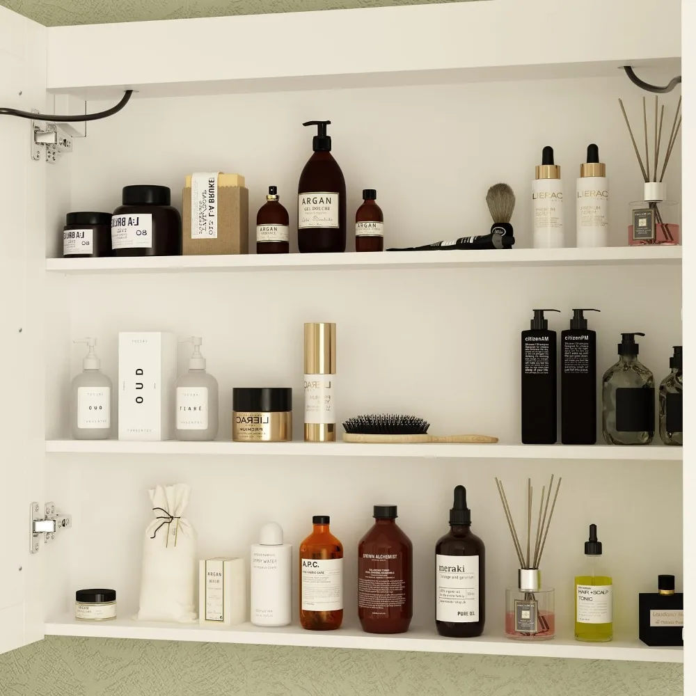 Inside, the cabinet features a spacious storage rack perfect for organizing toiletries, skincare, and everyday essentials. The adjustable lighting allows users to switch between warm, neutral, and cool tones, creating the ideal ambiance for any time of day. Crafted with durable materials and a minimalist silhouette, it fits seamlessly into modern, Nordic, and luxury bathroom interiors.