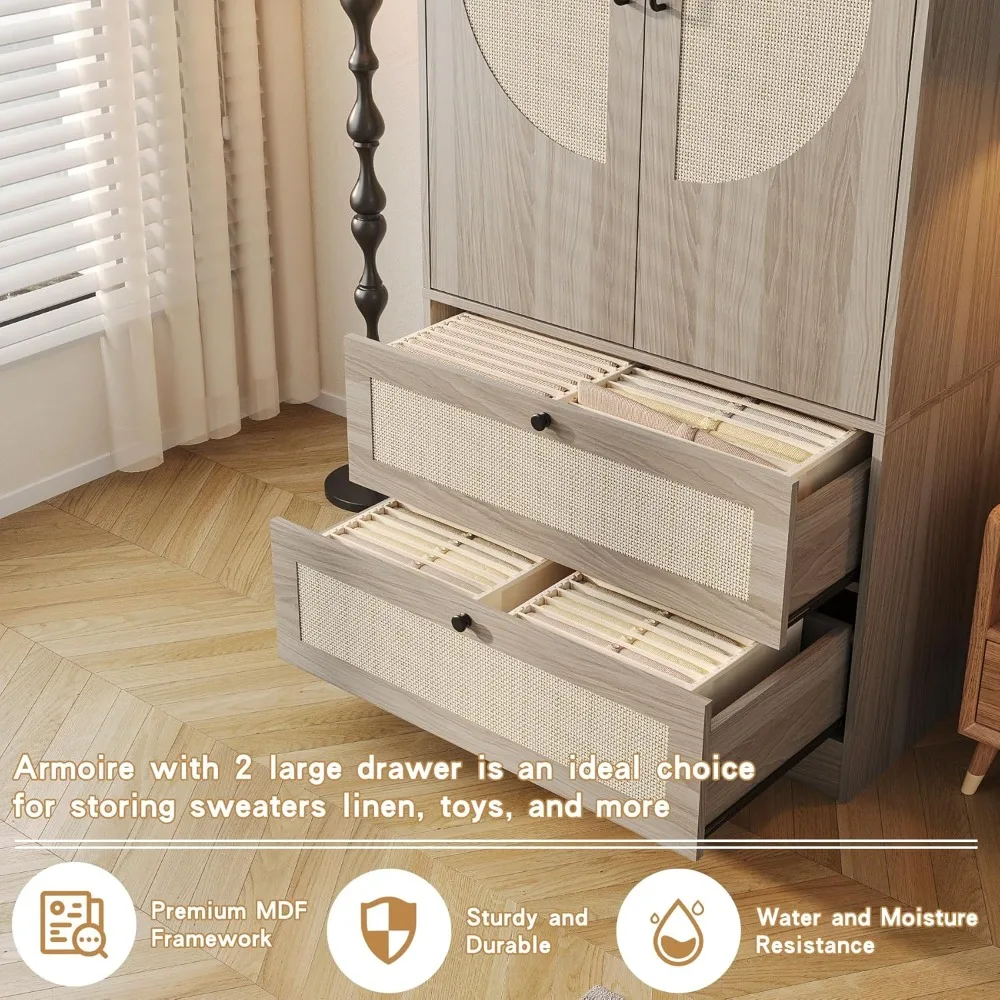 Inside, a full‑length hanging rod offers ample space for clothing, coats, and longer garments, while the two lower drawers provide convenient storage for folded items, accessories, or linens. The combination of open hanging space and enclosed drawer storage makes this armoire both practical and visually balanced.