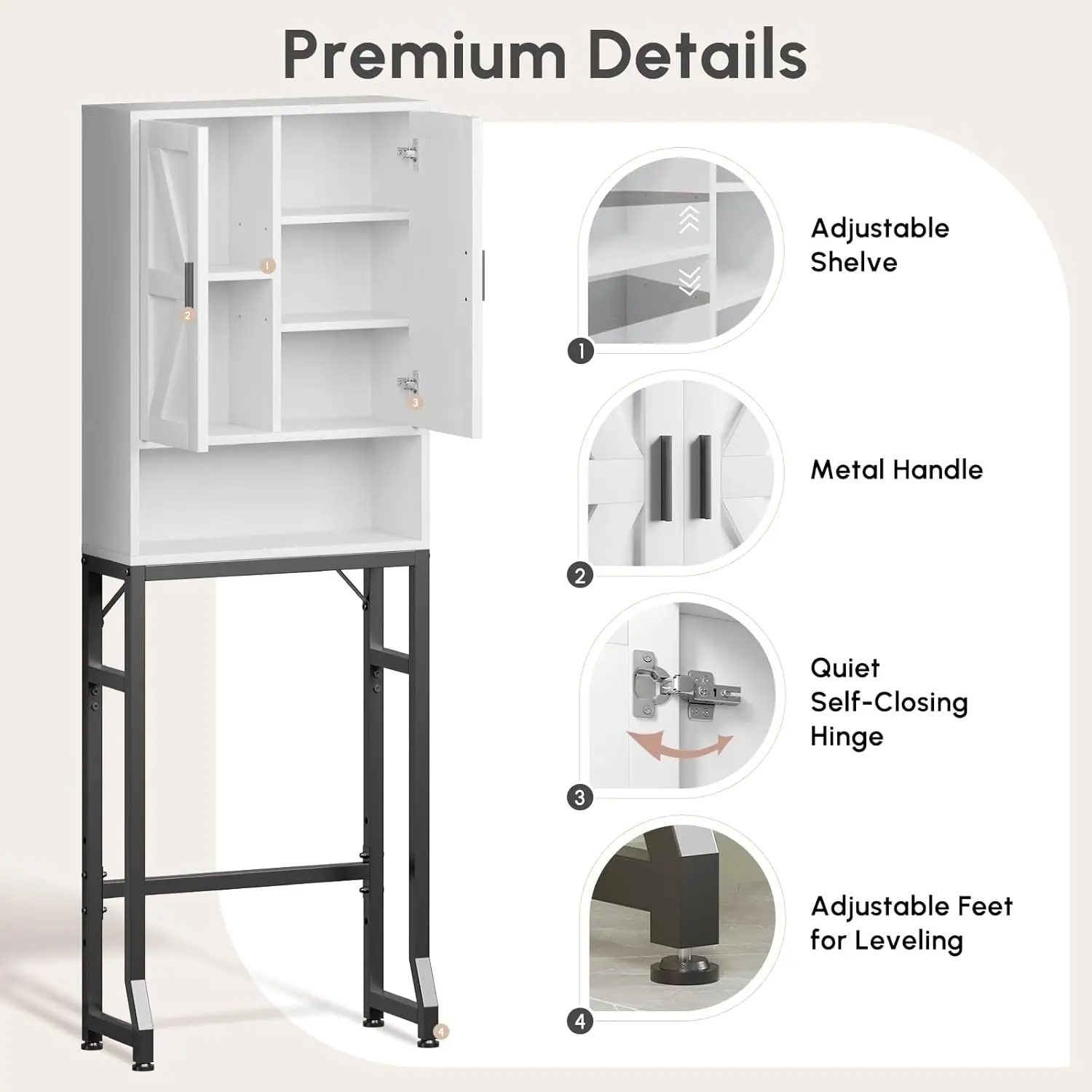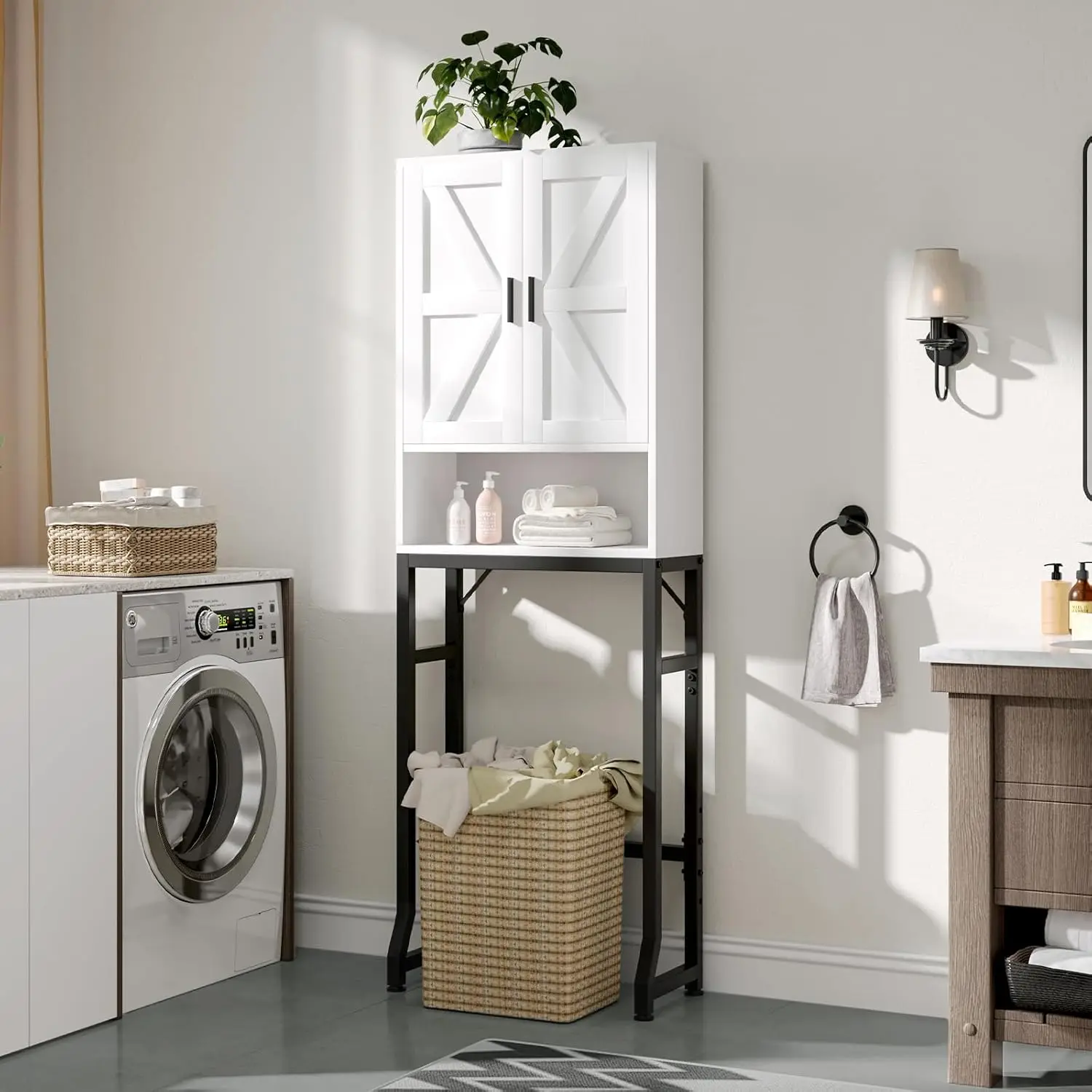 The barn‑door front adds a warm farmhouse touch while allowing you to conceal or display items as needed. Inside, adjustable shelves provide flexible storage for toiletries, towels, and bathroom essentials. The reinforced metal frame ensures stability, making the cabinet sturdy and secure even in high‑traffic bathrooms.